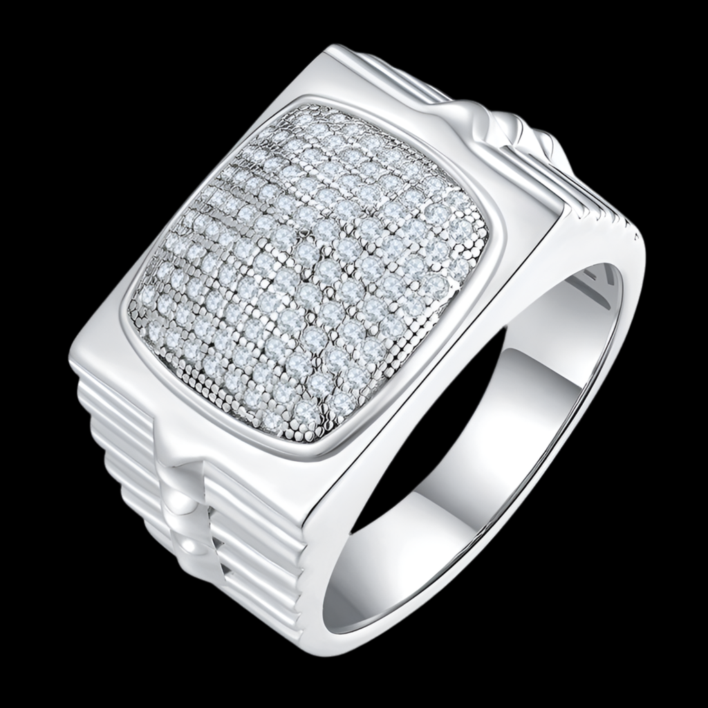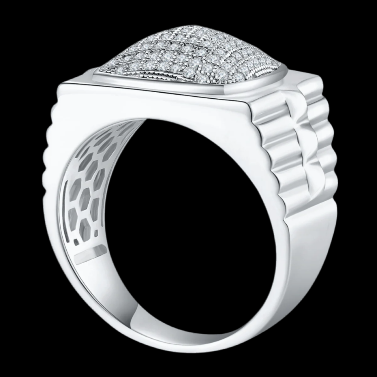 Details: S925 sterling silver, 18K white gold vermeil, Domed rectangular face fully pavéd with moissanite.