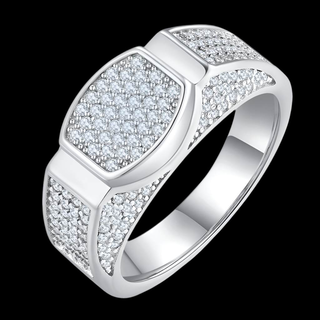 Details: S925 sterling silver, 18K white gold vermeil, Shield-shaped top fully pavéd with moissanite, Pavé detailing continues along the band sides.