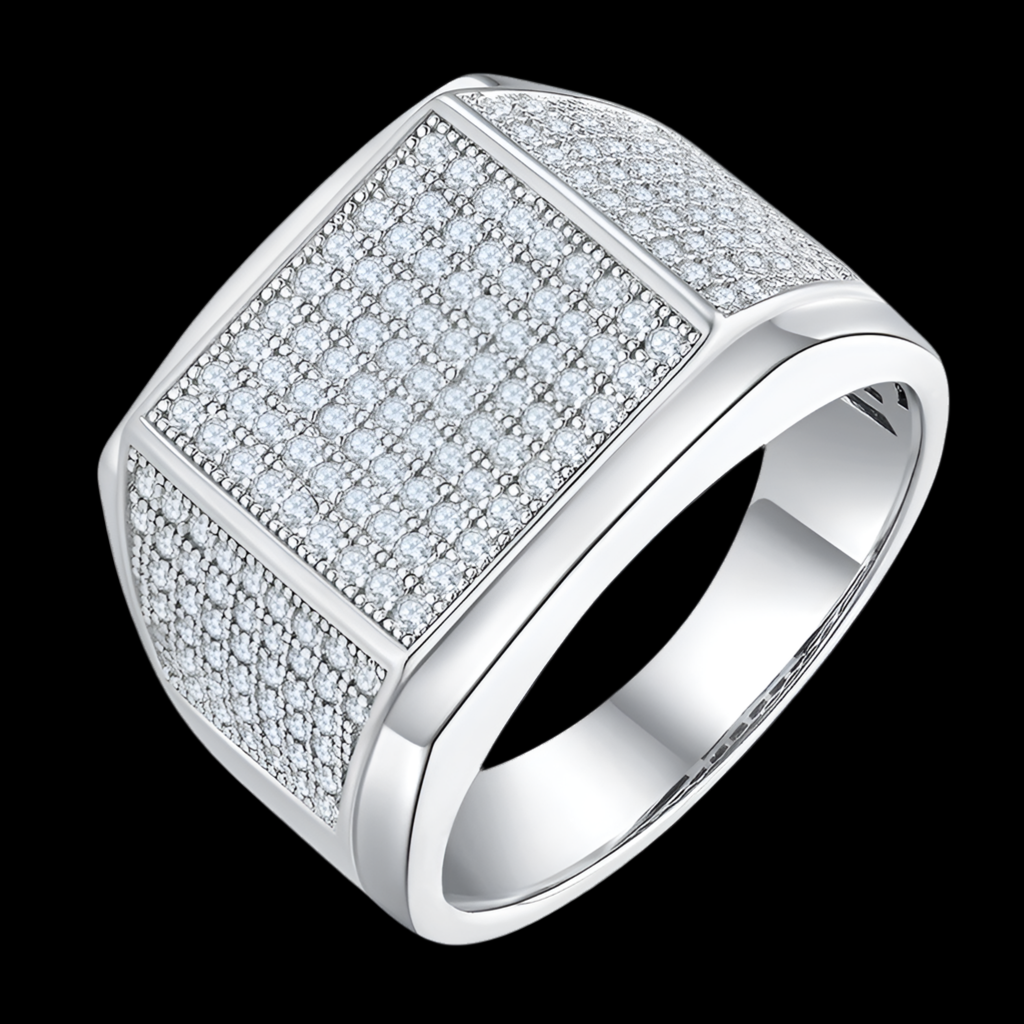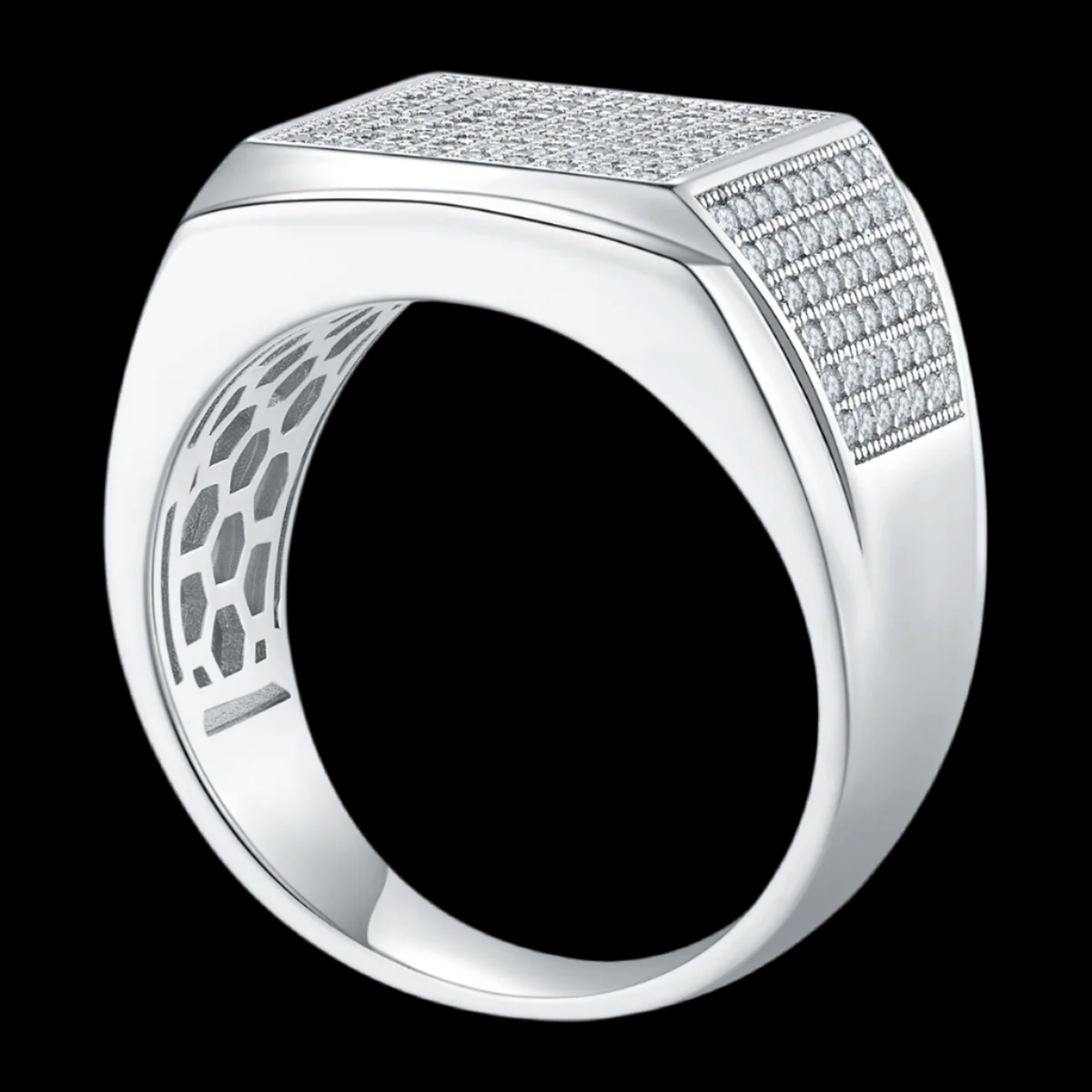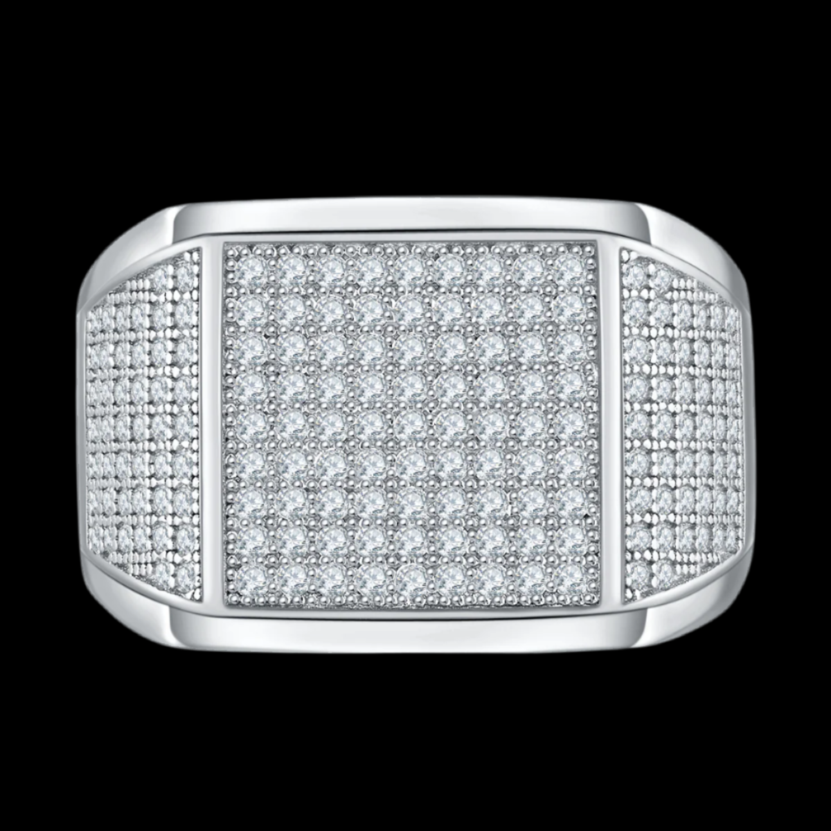 Details: S925 sterling silver, 18K white gold vermeil, Oversize rectangular face fully pavéd premium moissanite, Matching pavé panels on each side.