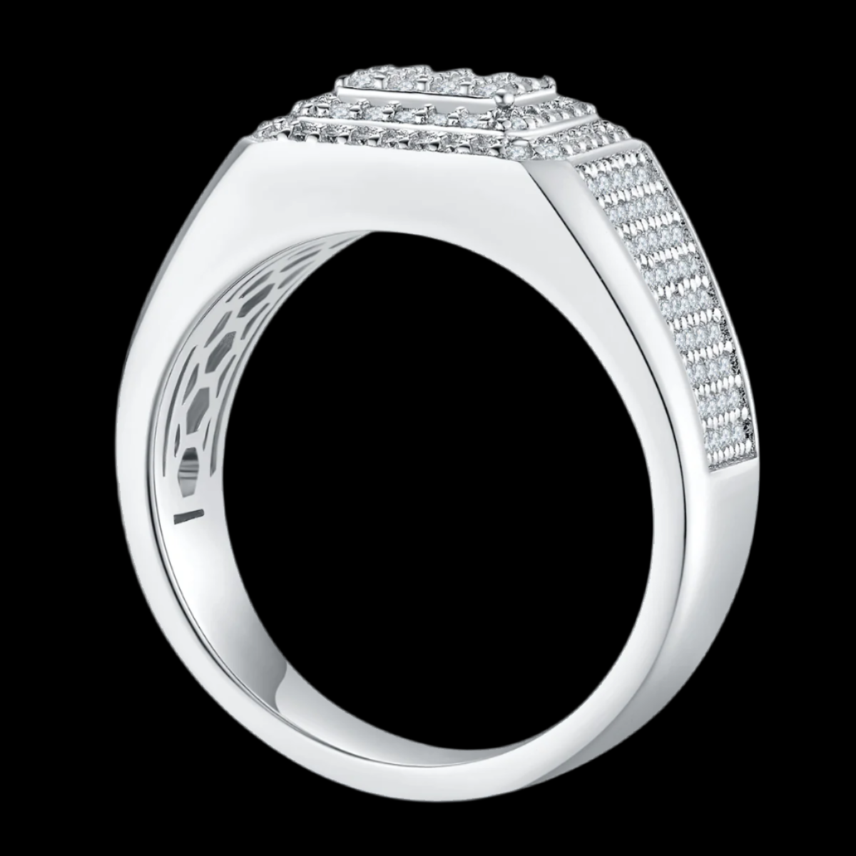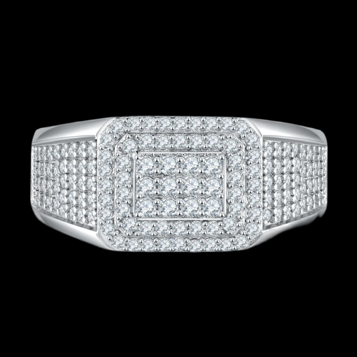 S925 sterling silver, 18K white gold vermeil, Raised rectangular face and band fully pavéd with moissanite.